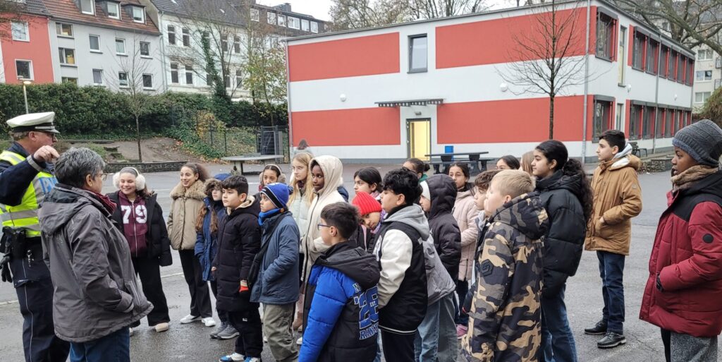 Die Klasse 5a beim Verkehrstraining auf dem Schulhof.